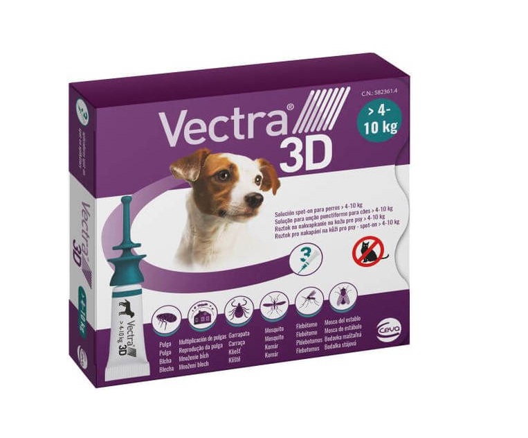אמפולות וקטרה (Vectra 3D) לכלב קטן. הקרטון מכיל 3 שפופרות כאשר כל שפופרת אמפולה מחזיקה 7 שבועות.
