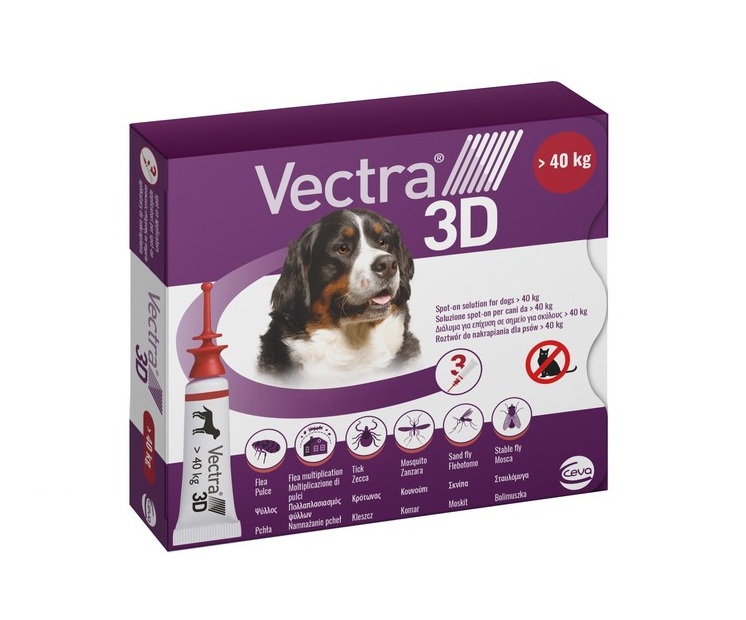 אמפולות וקטרה (Vectra 3D) לכלב ענק. הקרטון מכיל 3 שפופרות כאשר כל שפופרת אמפולה מחזיקה 7 שבועות.